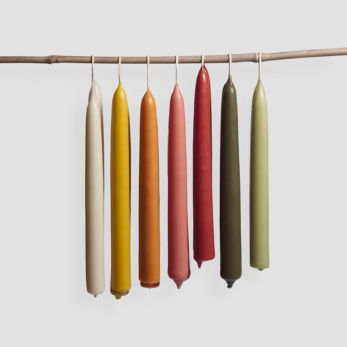 Our elegant Groundnut beeswax dining candles are made in small batches in the UK with traditional hand-dipping methods. Using pure beeswax and natural wax dyes, these earthy orange candles release a subtle aroma of honey when lit. The candles are sold in pairs joined at the wick.