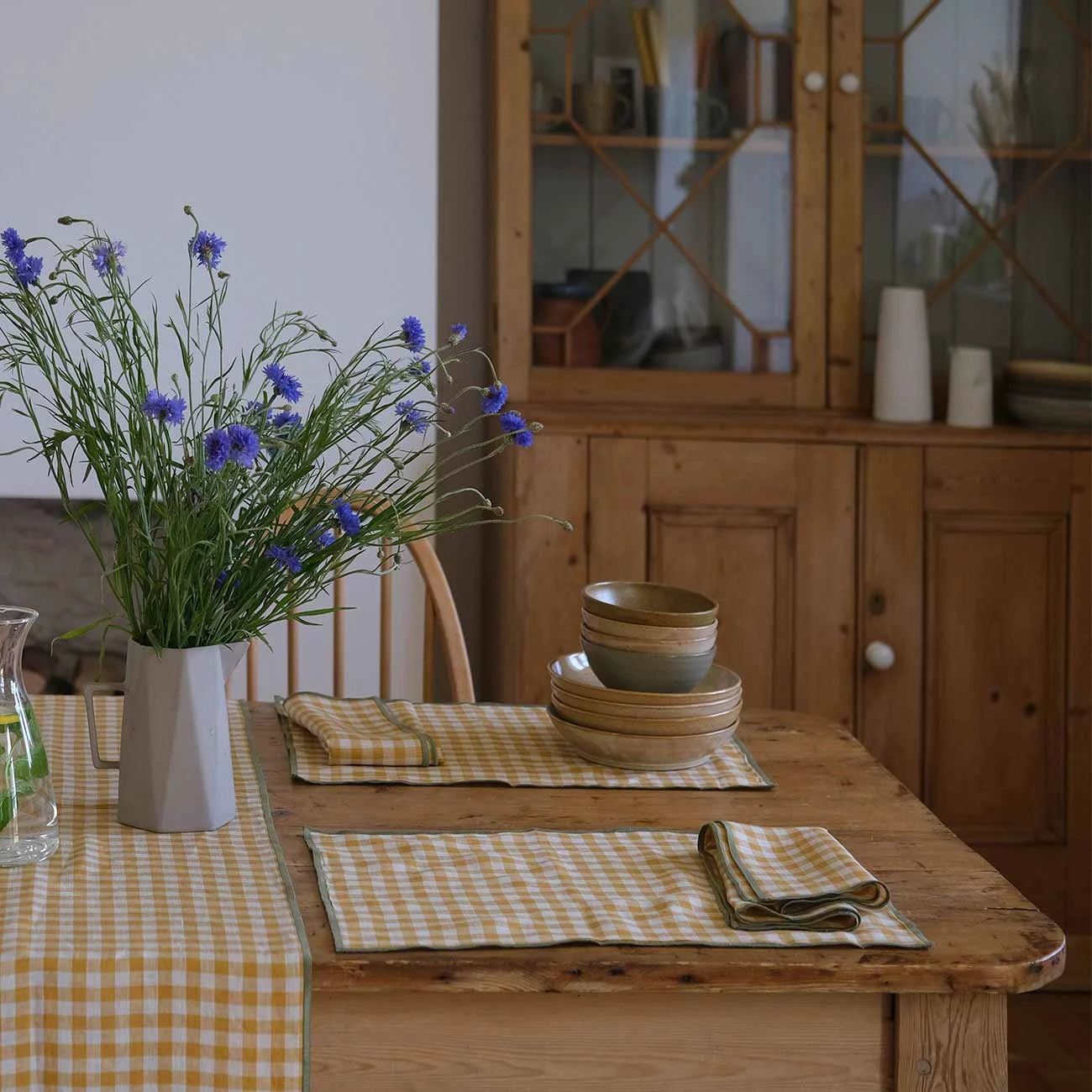 Made in Portugal, our Linen Napkin Set consists of a set of four napkins, made from 100% stonewashed European linen. Shown here in our pretty Honey Gingham pattern, finished with a contrasting overlocked border in Pear green. Complement your napkin set with the rest of our linen tableware range, including placemats, runners, and tablecloths.