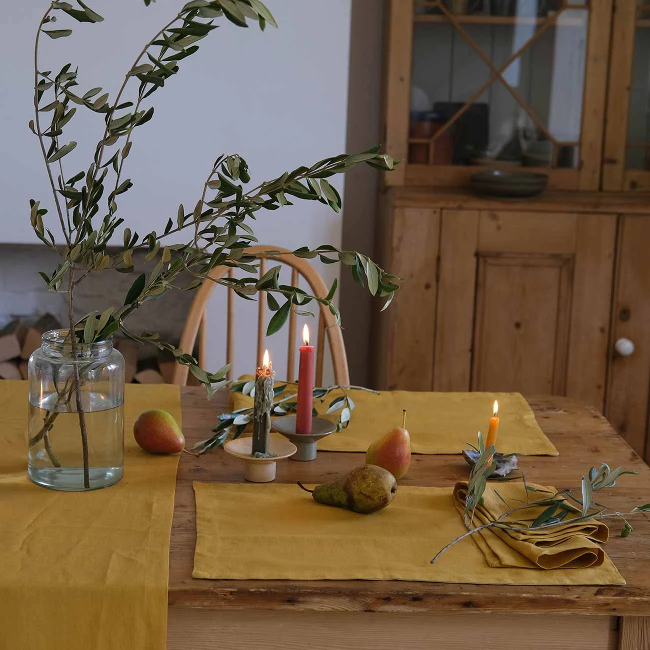 Made in Portugal, our set of Linen Placemats consists of four beautifully crafted placemats, made from 100% stonewashed European linen. Shown here in our pretty Honey shade, finished with an overturned seam. Complete your tableware set with the rest of our linen tableware range, including napkins, runners, and tablecloths.