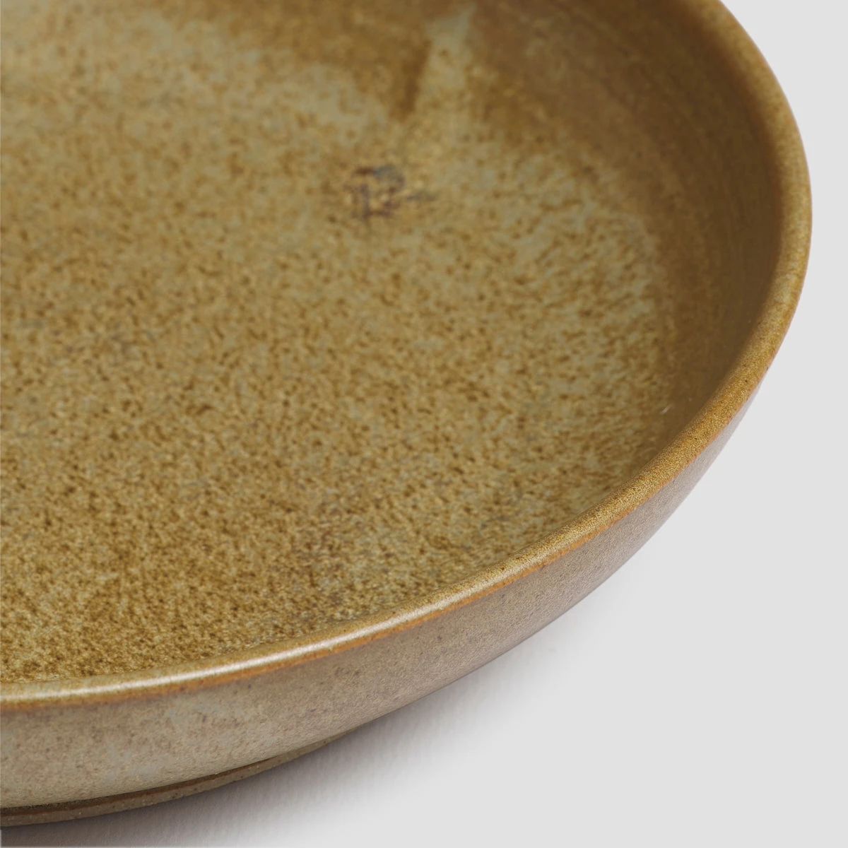 The Pottery West for Piglet Dinner Bowl has a beautiful, speckled finish and is perfect for entertaining or everyday dining. Each piece is hand-thrown in the Pottery West studio in Sheffield in the UK, using iron-rich flecked stoneware. The Ochre glaze is a complex, full finish named after one of its ingredients – iron ochre. Shades differ depending on the clay used, varying from a warm caramel brown, to orange, and even a little purple. Although glossy, this glaze has a semi-matte appearance in certain lights.
